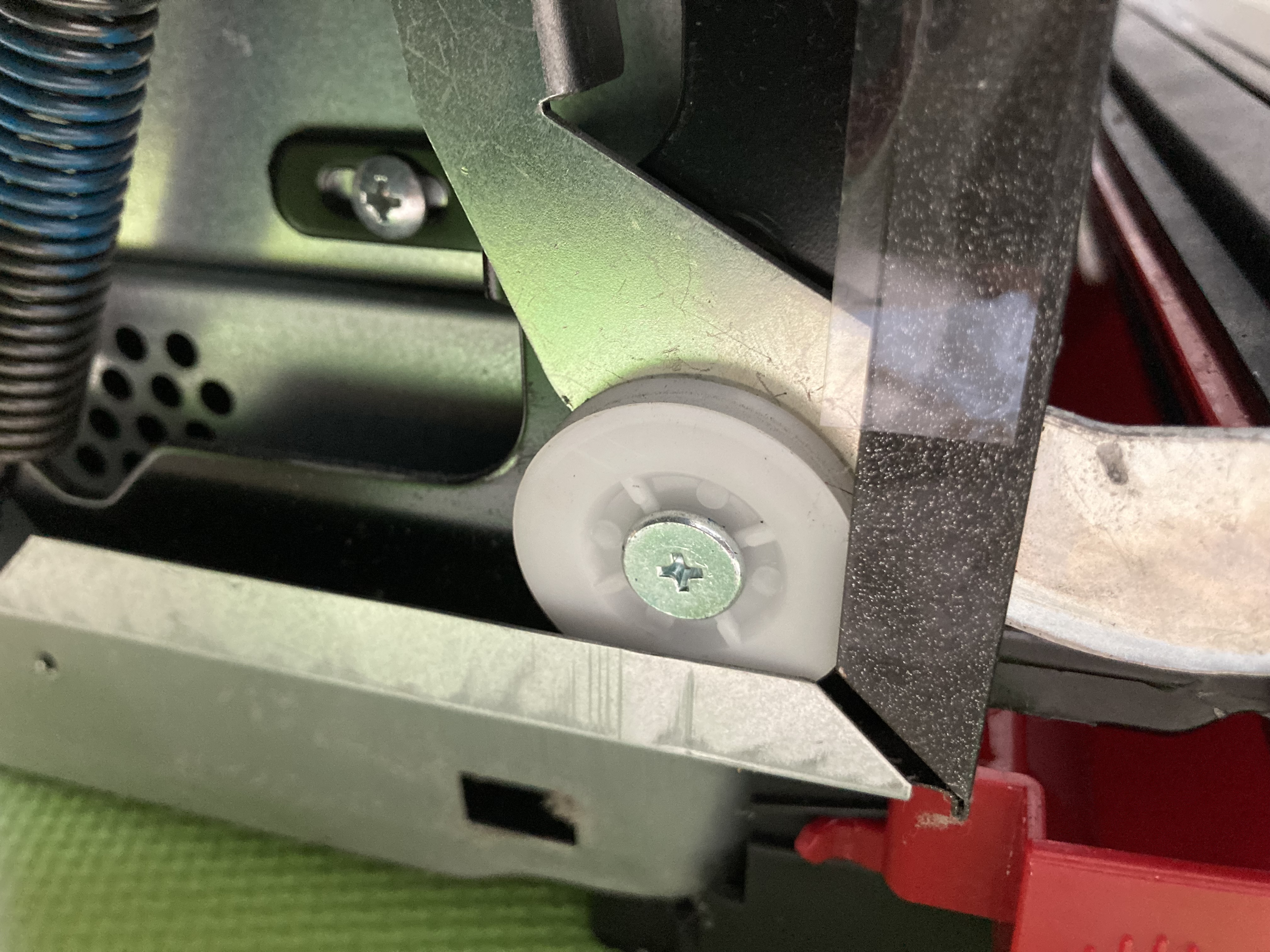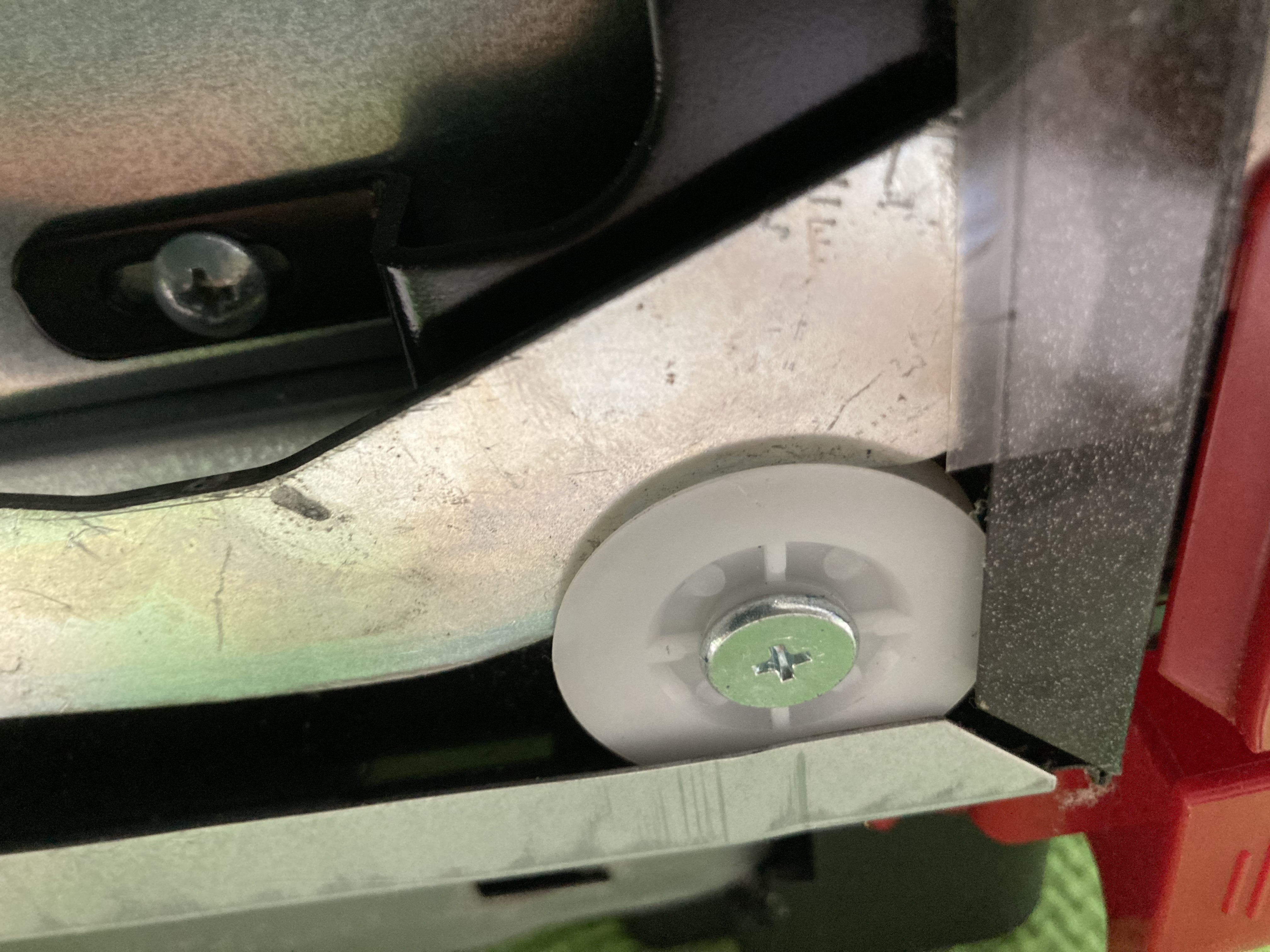 ①見ずらいですが、銀色のラッチがローラーから外れています。
